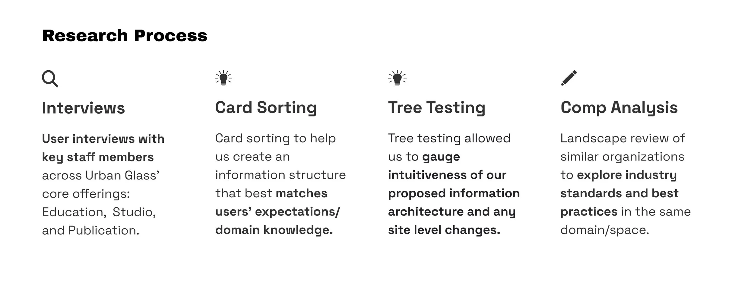 Based on our initial discussion with the director of Urban Glass, our project goal was to ensure that visitors of Urban Glass’ website understood the value of the organization and are aware of all that it has to offer. To do so, we decided to visually redesign the Urban Glass website and reorganize content to improve navigation and relevancy for new visitors.